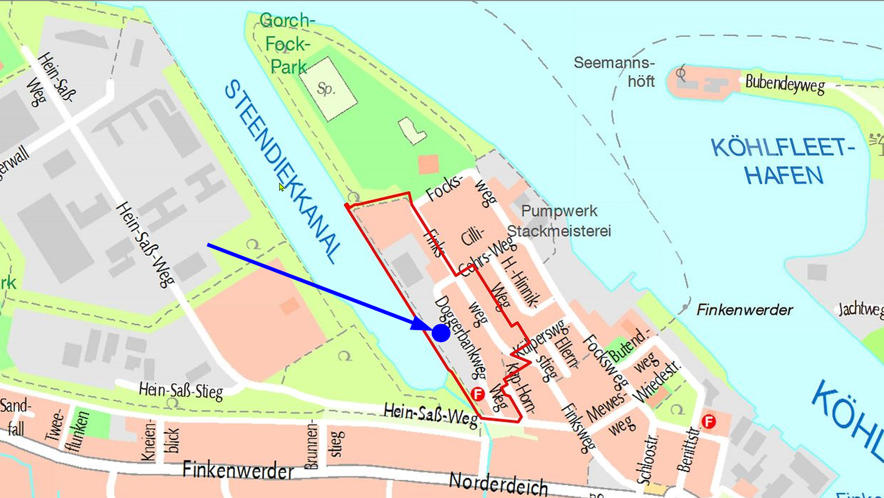 Die Baugemeinschaft Finkenwerder wird auf dem Baufeld 2 am Steendieekkanal (Doggerbankweg) bauen (siehe blauer Punkt). Das Grundstück wurde bereits käuflich erworben. Um unser Baufeld wird es über die nächsten Jahre noch weitere Baumaßnahmen geben. Sie sind innerhalb der roten Linie geplant.