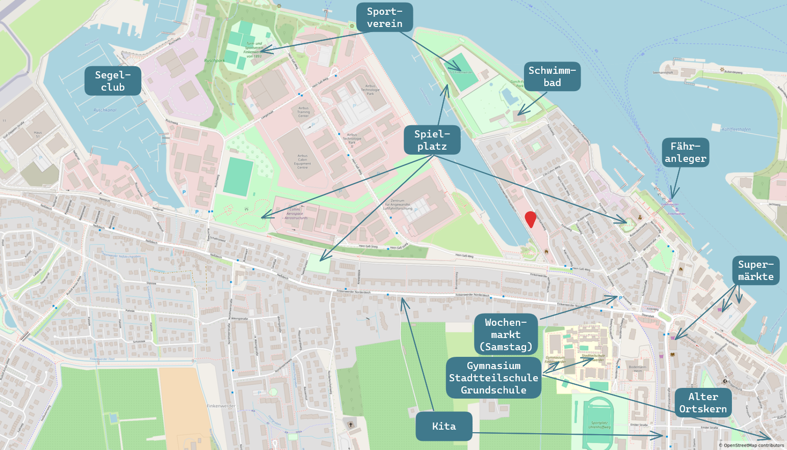 - Infrastruktur: Schulen, Kitas und Einkaufsmöglichkeiten sind fußläufig erreichbar, was Finkenwerder besonders für junge Familien attraktiv macht.